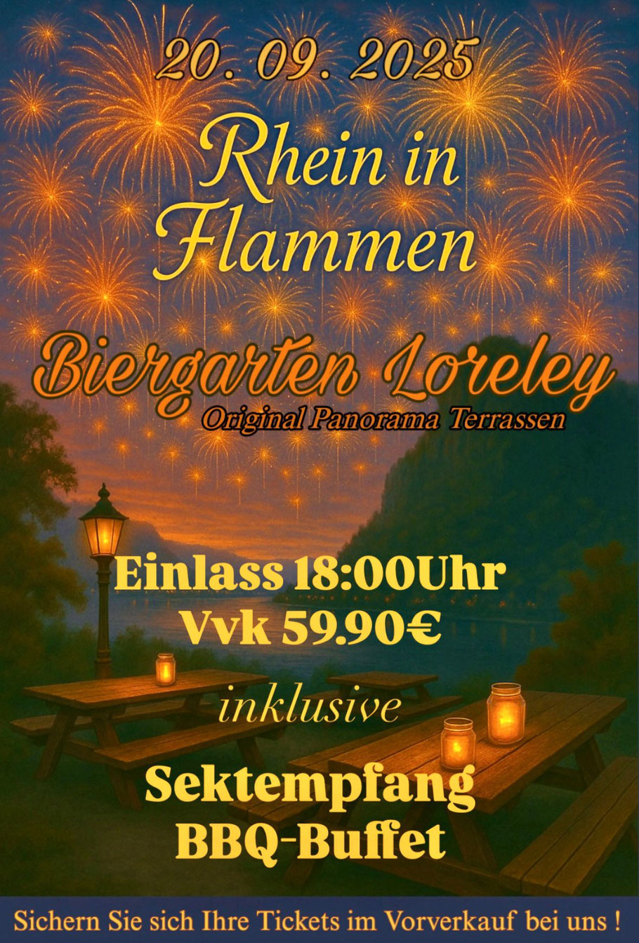 Für den Vorverkauf und Gruppenanfragen und zusätzliche Öffnungszeiten senden Sie bitte eine Email an: Biergarten.loreley@gmail.com